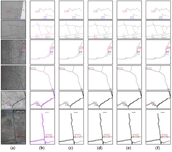 Figure 8 shows the detection results of different methods on the CrackTree260 dataset. Compared with the results of the crack detection methods shown in Figure 8c–e, the edge information of the cracks detected by our model was richer and had better continuity. Although the crack detection methods in Figure 8 can obtain relatively complete crack shapes, the crack detection methods in Figure 8c–e lost a lot of crack detail information and were more susceptible to noise compared to the model proposed in this paper. For example, there are relatively small cracks in the red and blue rectangles of the first image. Other methods can also detect cracks here, but there may be varying degrees of fracture, and the method proposed in this article can also detect small cracks more completely and continuously. In the third image, the noise is quite severe. Except for the algorithm in this article, all other algorithms are affected to varying degrees by the noise and background information in the image, resulting in missed detections and false positives of small crack details in the image.