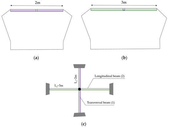 Once the loads of the mast placed on the bridge top have been established, it is necessary to quantify the strength contribution of each beam. As the cross-section is identical for constructive and structural criteria, it will be sufficient to calculate the most unfavorable of the two and duplicate the result obtained in the other one. For this purpose, a system of two equations with two unknowns is used. The first arises from the so-called compatibility equation, which will be the equality of displacements at the midpoint of a beam with its two fixed ends and a load at its midpoint. If P1 is the load supported by the transverse beam, P2 is the load supported by the longitudinal beam, L1 is the length of the transverse beam, and L2 is the length of the longitudinal beam, then: