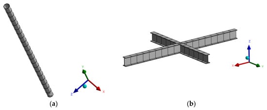 The solutions of this last system, other than the trivial one, satisfy , from which the n values of are obtained, which are the natural frequencies of the system without damping. Solving this equation for each of the eigenfrequencies gives its associated eigenvector , which represents the shape adopted by the structure at that particular natural frequency [27]. From this concept, and with the eigenvector matrix, the well-known concepts of modal share factors and effective mass (portion of the total mass, the complete weight of the structure, that contributes to dynamic responses in specific degrees of freedom) are employed to indicate the importance of each eigenfrequency.