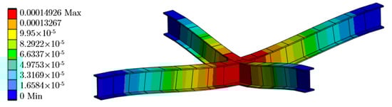 It is observed that the prestressed cables in the direction of the wind load decrease the maximum displacement by 88.3%, with a negligible effect when the location of the prestressed cables is perpendicular to the load direction. Therefore, it is recommended to use prestressed cables with a 90° offset in order to cover all possible load directions. On the other hand, the influence of the arrangement of brackets at the base of the mast, which are welded between it and the bridge top structure, is studied. The objective is the same as with the prestressed cables, but by means of a welding between elements that favors the transit of forces and moments on the local reinforcement. Figure 14 shows displacement for the standard wind load with four triangular brackets’ (200 × 200 mm) influence, 90° out of phase.
