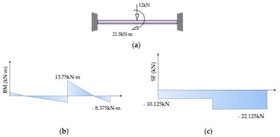 (a) Load condition and boundary condition, (b) bending moment (BM) diagram, (c) shear force (SF) diagram.