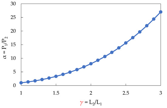 With α as the ratio between P1 and P2 and γ the ratio between L2 and L1, where 1 and 2 are the lengths of the transverse (shorter) and longitudinal (longer) beams, a cubic parabola-type (α = γ 3) relationship is obtained between the two variables (Figure 8):