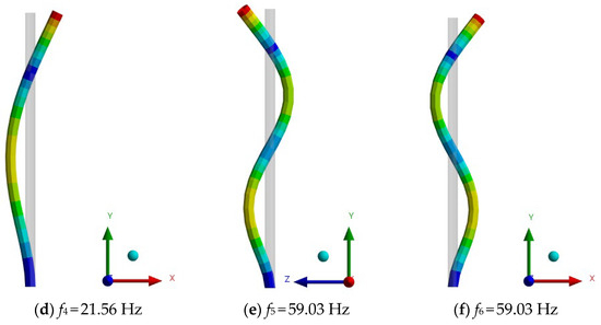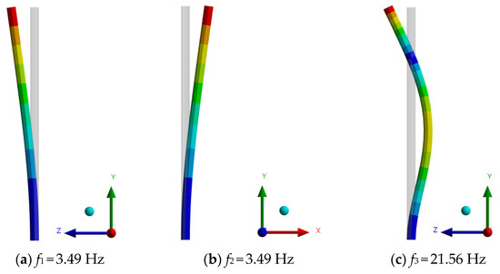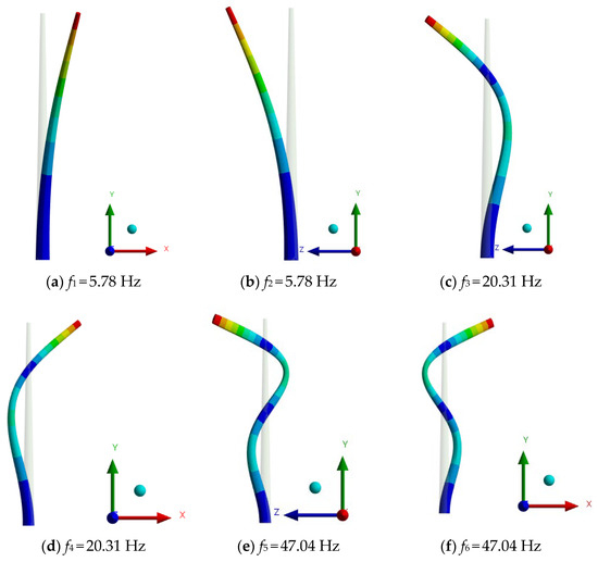 Modal analysis involves identifying the fundamental dynamic characteristics of the mast, including natural frequencies and mode shapes. These characteristics are then utilized to establish the system’s dynamic or quasi-static behavior. Figure 9 shows the first eigenfrequencies and eigenmodes of the mast in the initial condition.