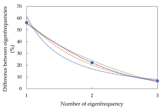 A difference of varying magnitude is observed between the eigenfrequencies of the solid circular cross-sections, the constant and the variable ones. In the first case, there is a difference of 56.19%, in the second one 22.18%, and in the third one 6.68%. A design tool based on regression models is established in terms of structural design, which allows us to establish the evaluation of the eigenfrequency of the constant or variable section mast from the knowledge of only one of them, with the advantages derived from this. Figure 11 shows graphically the percentage evolution of the differences between each of the eigenfrequencies previously calculated, for the constant and variable sections, with the comparison of different regression models. The potential regression is depicted by the blue line, while the orange line represents exponential regression. The purple line corresponds to a second-order polynomial regression, and lastly, the green line portrays logarithmic regression.