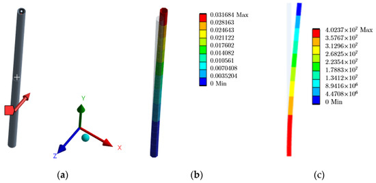 Mast under wind loading. (a) Force representation, (b) maximum displacement (m), (c) maximum stress.