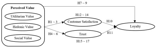 Perceived value also plays a pivotal role in shaping loyalty. When customers consistently experience high value, they are more likely to become loyal to the brand. Loyalty is driven by the belief that the brand consistently meets or exceeds expectations and provides worthwhile benefits. Thus, creating and delivering perceived value can be a strategic approach to fostering and maintaining customer loyalty. Chang et al. [53] and Haghkhah et al. [54] demonstrated that perceived value influences customer loyalty in the lumber market and business-to-business services, respectively. Additionally, Sirdeshmukh et al. [10] found that perceived value significantly affects loyalty in the retail and airline industries. The following hypotheses are proposed to understand the relationship between perceived value dimensions and loyalty in entertainment platforms: