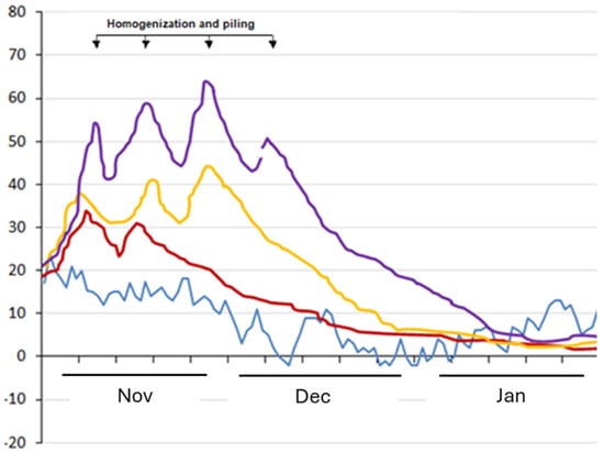 The initial chemical properties and the monitoring of co-composting confirmed the suitability of the S and GW to be co-composted, as previously seen in Macci et al. [17] (2023). In fact, the pH was in an optimal range (5.5–8) for the microbial development and activities [1] (Azim et al., 2018). The increase in microbial biomass and respiration rate during co-composting suggests the optimal conditions for biological activities and the absence of possible osmotic stress, despite the initial high EC in all piles [45,46,47] (Bremer and Krämer, 2019; Yan et al., 2012; Sanchez 2023). The relative amount of TOC and TN was an important indicator of nutrient contents and organic matter degradation fate [48] (Onwosi et al., 2017). The three piles showed a lower initial TOC/TN than the recommended values (25–30), suggesting a fast organic matter degradation process and the possible ammonia volatilization [1,48,49] (Jurado et al., 2014; Onwosi et al., 2017; Azim 2018). However, the feasibility of composting at lower TOC/TN ratios had been previously demonstrated [50] (Kumar et al., 2010), including for S-GW co-composting [17] (Macci et al., 2023). During the co-composting, the TOC reduction is expected due to the conversion of organic carbon into CO2 by microbial metabolism [1] (Azim 2018). However, such a decrease could be limited in co-compost with high S amount due to the low content of less degradable carbon sources in the S [17] (Macci et al., 2023). In fact, the TOC significantly reduced only in pile C, while in the other piles, the TOC reduction was not statistically significant. However, the trend of the respiration rate better highlighted that the organic degradation occurred in all piles: in fact, after the first phase of the reduction in respiration rates, probably due to the microbial acclimatation to experimental conditions [51] (Nikaeen et al., 2015), the microbial respiration rate increased in all piles. The microbial respiration is positively correlated to the presence of the labile fraction of organic matter, stimulating the biological activities and the organic matter degradation [47,51] (Nikaeen et al., 2015; Sanchez 2023). Also, the reduction in TN occurred in pile C and it could be related to the release of ammonia, which could have phytotoxic effects [1] (Azim et al., 2018). However, the germination test highlighted the absence of toxic effects in pile C, as well as in others, with values above 50%, thus the final co-compost resulted suitable for plant growth [18] (Peruzzi et al., 2020). This was also enforced by the metal concentrations below the legislation limits for the use of the co-compost as growing media [31] (D.lgs. 75/2010).