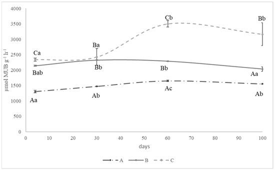 Time course of butyrate esterase activity during the co-composting in piles A (3S:1GW), B (1S:1GW), and C (1S:3GW). Different lowercase letters indicate statistically different values (time effect) within each co-compost. Different uppercase letters indicate statistically different values (treatment effect) within each time. Bars represent standard deviation.