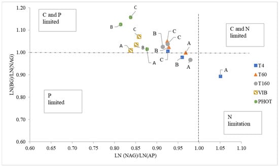 Ecoenzymatic stoichiometry of the co-composts (A = 3S:1GW; B = 1S:1GW; C = 1S:3GW) after 4 (T4), 60 (T60), and 100 (T100) days of co-composting and after the plant cultivation. The dot lines represent the equilibrium amongst enzymatic activity ratios. BG = β-glucosidase; AP = acid phosphatase; NAG = N-acetylglutamate synthase. VIB = Viburnum tinus; PHOT = Photinia and phaseri. Dotted lines represent the equilibrium between enzyme activities (lnBG:lnNAG:lnAP 1:1:1).