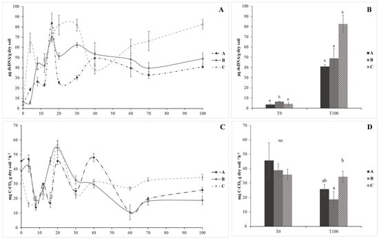 In Figure 3, the enzymatic stoichiometry analyzed during co-composting and after plant cultivation is analyzed. Specifically, the dot lines in Figure 2 represent the equilibrium amongst enzyme activities (BG:NAG:AP = 1:1:1) and the variation from the equilibrium revealed the microbial nutrient limitation. At T4, co-compost A showed N-limited condition as ln(NAG)/ln(AP) was above 1 (1.05 ± 0.004), while co-compost B and C showed values for ln(NAG)/ln(AP) below 1 (0.96 ± 0.012 and 0.93 ± 0.005), respectively, resulting more P limited. The C-to N-acquiring enzyme ratio (ln(BG)/ln(NAG)) was below 1 in co-compost A (0.89 ± 0.003), confirmed the N-limited condition, while in co-composts B and C, the BG and NAG ratios were close to equilibrium (BG:NAG = 1:1) (B = 0.98 ± 0.016; C = 1.01 ± 0.011). After 60 days of co-composting, co-compost A showed the values of 1.00 ± 0.001 and 0.97 ± 0.001 for ln(BG)/ln(NAG) and ln(NAG)/ln(AP) ratios, and as a result, were P-limited. In co-compost B, the ln(BG)/ln(NAG) and ln(NAG)/ln(AP) ratios reached values of 1.02 ± 0.016 and 0.93 ± 0.013, respectively, shifting from P-limited to C- and P-limited. The co-compost C showed the following values: ln(BG)/ln(NAG) = 1.05 ± 0.027 and ln(NAG)/ln(AP) = 0.92 ± 0.01, remaining in C- and P-limited conditions. At the end of the co-composting, the co-compost A resulted in a P-limited (ln(BG)/ln(NAG) = 0.97 ± 0.01; ln(NAG)/ln(AP) = 0.98 ± 0.001). Instead, the co-composts B and C were C and P limited, showing values of 1.03 ± 0.01 and 1.04 ± 0.061 in co-composts B and C, respectively, while the ln (NAG)/ln (AP) reached the following values: 0.91 ± 0.017 in B and 0.93 ± 0.043 in C.