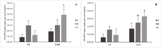The 16S (bacterial, A) and 18S (fungi, B) rRNA genes copy numbers (±standard deviation) in the three piles during the composting process. Compost pile A (3S:1GW), B (1S:1GW), C (1S:3GW). Different lowercase letters represent significant differences for p < 0.05.