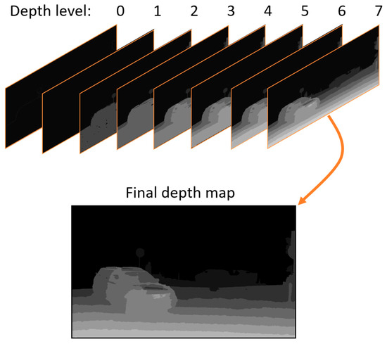 An example of alpha-expansion-based optimization performed for 8 depth levels is presented in Figure 1. At the top, the results of each optimization can be seen. The result of the last optimization (for 7th depth level), enlarged at the bottom, is the final depth map. After all the iterations are performed, the process of optimization can be performed again, in the latter cycle of iterations [14], so the ‘final depth map’ (Figure 1) becomes the input to another optimization.
