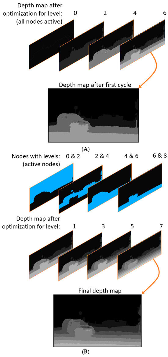 Performing the first, coarse optimization leads to an initial, low-detail depth map if used for geometry estimation (Figure 2A). This rough estimation is the start of the next cycle of iterations in which the number of labels (depth levels) required to be examined for each segment is reduced from to only labels (Figure 2B). Therefore, the number of pixels active in these iterations is significantly decreased, and their set is