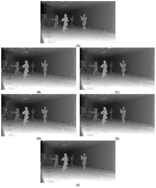 The comparison of depth maps estimated for the MartialArts sequence. Depth maps estimated using graph-cut optimization with: (A) alpha-expansion, (B) hierarchical alpha-expansion (), (C) hierarchical alpha-expansion (), (D) hierarchical alpha-expansion with second-cycle label shift (), (E) hierarchical alpha-expansion with second-cycle label shift (), (F) hierarchical alpha-expansion with second-cycle label shift and neighboring segments label examination.