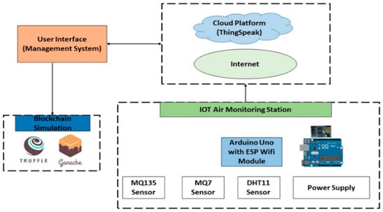 The contribution of this research is providing a reliable air quality monitoring station at a low cost and with low power consumption. Moreover, the ease of use and installment is a very important point. Also, the simulation of blockchain technologies highlights the synergies between blockchain and IoT technologies.