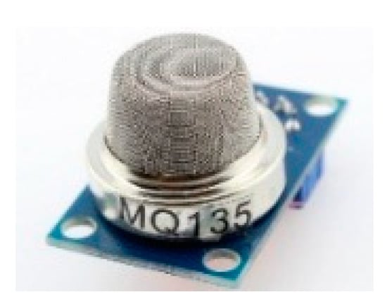 The MQ135 sensor is a gas detector, capable of detecting a large spectrum of gases, including ammonia, benzene, nitric oxide, smoke, and carbon dioxide. It can be operated in both indoor and outdoor environments. Moreover, MQ135 has good sensitivity to carbon dioxide. It is also cost-effective and has a long operational lifespan [16]. The sensor is shown in Figure 3.