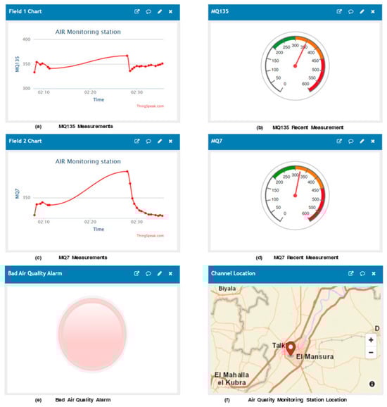 Figure 11 shows the ThingSpeak platform dashboard, which contained the flow of measurements of carbon dioxide, carbon monoxide, the location of the IoT station, and the bad air quality alarm. The first row shows the measurements for carbon dioxide, which came from the MQ135, and the gauge of the last reading.