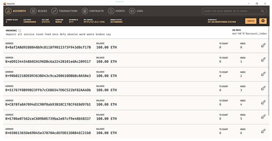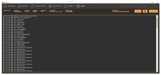 The blockchain GUI is shown in Figure 12 and Figure 13. Figure 12 shows the Ganache GUI of the first created workspace IoT air monitoring station that was used to simulate blockchain on the Ethereum platform. It shows an overview of the Ethereum accounts provided by Ganache for development purposes. Each account typically has an address and a test Ether (ETH) balance for simulating transactions. Figure 13 shows the Ganache logs of information at the start of the software code, which helps diagnosis if it is not successfully started and if something is not working smoothly.