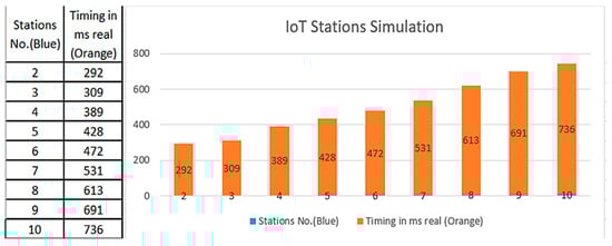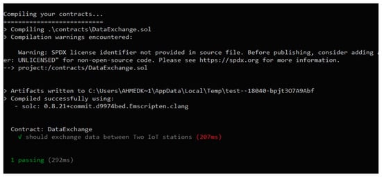 Figure 14 shows the testing contracts used to simulate the smart contracts on Truffle to test the process of data exchange. It shows the compilation of the Solidity code to simulate exchange of data between two IoT stations, with total times of 207 ms for execution and 292 ms to pass the test. Also, Figure 15 shows the increase in time with the increasing number of stations sending data, which was also simulated locally on the same machine.
