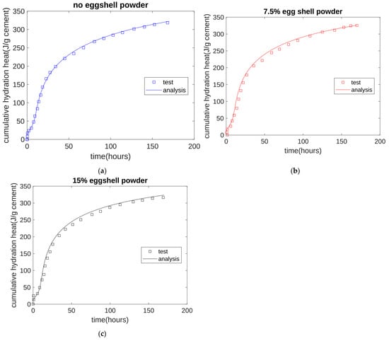 The calibration of hydration model parameters is divided into two steps. First, based on the cumulative hydration heat measurement results of cement paste without eggshell powder, the numerical regression method is used to calibrate the parameters B, C, kr, and De0 of the cement hydration model. Secondly, keeping the parameters B, C, kr, and De0 unchanged, the nucleation effect parameter nu of eggshell powder was calibrated according to the measurement results of the cumulative hydration heat of 15% eggshell powder. The parameters of these hydration models are presented in Table 1.
