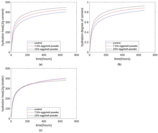 The calculation results of the early hydration heat are shown in Figure 1. Figure 1a shows that in the early stage of the hydration reaction, the cumulative hydration heat increases rapidly. This is because in the early stage of the hydration reaction, the rapid reactions of C3A and C3S releases a large amount of hydration heat. After about 50 h, the growth rate of hydration heat slows down. This is mainly because diffusion becomes the controlling process of the hydration reaction, which reduces the rate of heat release. From Figure 1a to Figure 1b,c, the cumulative hydration heat of cement based on unit mass increases slightly. This is mainly because the physical effect of eggshell powder accelerates the hydration of cement and releases more heat.