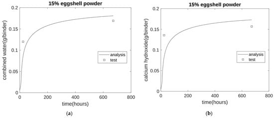 Figure 4a,b show the predicted results of chemically bound water and calcium hydroxide for the 7.5% eggshell powder specimen, and Figure 5a,b show the predicted results of chemically bound water and calcium hydroxide for the 15% eggshell powder specimen. From Figure 3a, Figure 4a, and Figure 5a, we can see that at 28 days, for the samples with eggshell powder content of 0%, 7.5%, and 15%, the chemically bound water at 28 days is 0.191, 0.188, and 0.180 g/g binder, respectively. As the eggshell powder content increases from 0 to 15%, the mass of chemically bound water per gram of binder decreases. This is because in the later stage of curing, as the eggshell powder content increases, the dilution effect of the eggshell powder plays a dominant role, reducing the amount of chemically bound water generated. From Figure 3b, Figure 4b, and Figure 5b, at 28 days, for samples with 0%, 7.5%, and 15% eggshell powder, the calcium hydroxide at 28 days is 0.183, 0.179, and 0.173 g/g binder, respectively. The development trend of calcium hydroxide is similar to that of chemically bound water. In addition, we can see that at 28 days, as shown in Figure 5a (15% eggshell powder), the calculated chemically bound water is slightly higher than the experimental chemically bound water. This may be because in the calculation, we ignored the pore refinement effect of the chemical reaction of eggshell powder. In our calculation, it is assumed that all capillary water (W0 − 0.38 C0α) can be used by cement hydration. However, the chemical reaction of eggshell powder will refine the pores, resulting in an increase in the fine pore content [26,27]. In fact, the capillary water available for cement hydration reaction is lower than (W0 − 0.38 C0α). Since this pore refinement effect is not considered in our calculation, the calculated values of hydration degree and chemically bound water are slightly higher. At 28 days, for the specimens containing 15% eggshell powder, the calculated results of chemically bound water and calcium hydroxide are slightly higher than the experimental results.