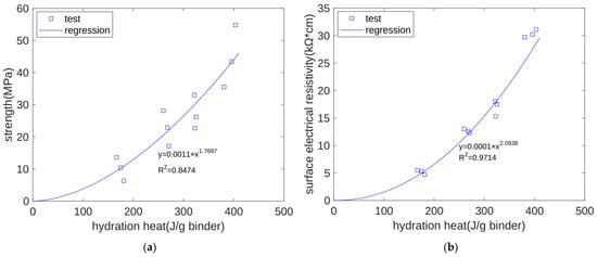Equations (6) and (7) are obtained from regression analysis. We calculated the cumulative hydration heat at 3 days, 7 days, and 28 days through the hydration model. In reference [24], the authors tested the strength at the same ages and the surface electrical resistivity at the same ages. This paper obtained the relationship between cumulative hydration heat and strength (Equation (6)) and the relationship between cumulative hydration heat and surface electrical resistivity (Equation (7)) through power function regressions.