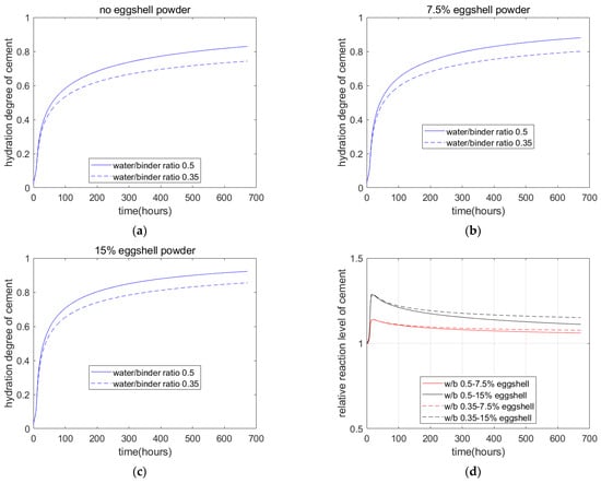 Parameters study of proposed hydration model. (a) No eggshell powder, water–binder ratios 0.50 and 0.35. (b) A proportion of 7.5% eggshell powder, water–binder ratios 0.50 and 0.35. (c) A proportion of 15% eggshell powder, water–binder ratios 0.50 and 0.35. (d) Effects of eggshell powder contents and water–binder ratio on relative reaction level of cement.