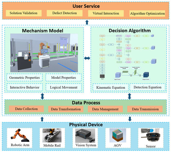 Physical devices primarily include components such as robotic arms, mobile rails, vision systems, sensors, and AGVs used in quality inspection workstations. The mechanism model is constructed through geometric modeling and model rendering to create three-dimensional representations of the physical equipment. This includes kinematic models and topological structures. By simulating geometric features, motion models, and decision systems, the digital model achieves a comprehensive mapping of the physical equipment information. The User Service layer, leveraging the effective virtual-to-real mapping mechanism between physical and digital spaces, enables process simulation, solution validation, and algorithm optimization for quality inspection workstations in the virtual environment. Digital space and physical space interact through a data management system, enabling data collection, transmission, computation, and feedback for devices. Quality inspection robots capture images of the workpiece surface using cameras. The decision system invokes defect detection algorithms to analyze the quality of the workpiece surface. After processing, the results are fed back to the user service end, thus achieving the simulation-driven quality inspection robot workstation system.
