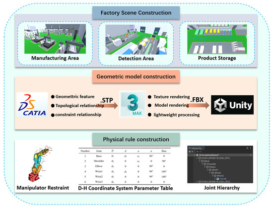 14]. Digital model construction involves integrating physical information to map virtual units to the geometry, structure, properties, behavior, rules, logic, and entire product lifecycle of physical entities. This process includes three main components: setting up workstations, constructing geometric models, and defining physical rules for robots. Workstation scene construction involves setting up virtual scenes for production areas, inspection zones, and finished product areas by configuring scene cameras, UI elements, scripts, and lighting. This process aims to achieve a highly accurate representation of factory environments. Geometric model construction involves building the geometric model of a quality inspection robot using the 3D modeling software CATIA, ensuring that the model components have the same structure, shape, size, and assembly relationships as the actual robot. The model is then imported into 3Ds Max, a 3D rendering software, to apply high-fidelity texture materials and color attributes, enhancing the visual effect of the model. Robot physical rule construction involves loading forward and inverse kinematics models onto the three-dimensional model of the robot within the virtual simulation engine Unity3D. This process enables the robot to simulate movement in digital space, ensuring a genuine constraint relationship between the behavior of the physical entity and the established rules.