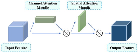 21]. In the aspect of defect detection, the YOLOv7 algorithm still has the disadvantage that it is difficult to detect because the detected target is small and the features are not obvious. On the foundation of the YOLOv7 algorithm, the improved YOLOv7 algorithm incorporates the Convolutional Block Attention Module (CBAM) attention module into the feature fusion network. The CBAM incorporates both spatial attention and channel attention mechanisms, gradually refining feature maps. This approach emphasizes important features while suppressing less relevant information. The model architecture is illustrated in