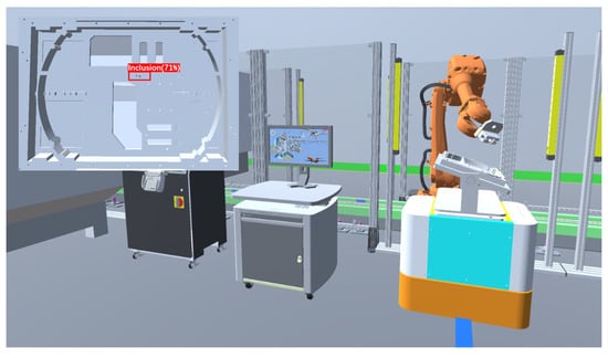 Using the PyTorch 1.13.1 + CUDA 11.7 deep learning framework, we train the algorithmic model and subsequently deploy it to the quality inspection robot’s workstation’s virtual simulation platform. Within the virtual environment, we conduct defect detection experiments. First, we export the model’s weight file (.weights) and configuration file (.cfg) to the ONNX format. Next, in Unity3D, we utilize the Barracuda library from ML-Agents to load the ONNX model. By writing C# scripts, we load the model, process input images captured by the camera, and invoke the model for inference. The output of the YOLO model includes detected object bounding boxes, class labels, and confidence scores. By writing scripts, we parse these outputs and transform the detection results into visual elements within the Unity scene. This is achieved by creating UI elements in the scene to display the detection boxes and category labels, enabling defect detection for workpieces.