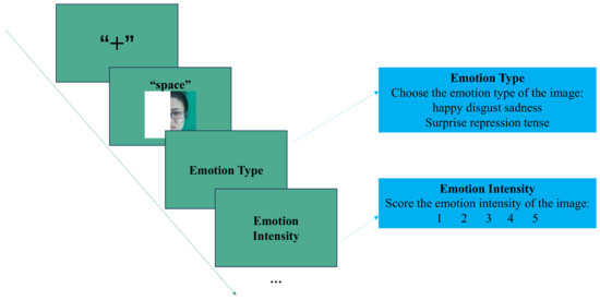 In this experiment, subjects were asked to view emotional stimuli displayed on computer screens and answer two questions about emotion types and intensity based on the presented images. Subjects can adjust the distance between themselves and the computer screen while watching the instructions. Still, after entering the formal experimental program, subjects were seated at a distance of 60 cm from the screen with their heads lined up to the center monitor.
