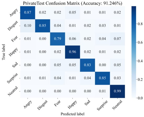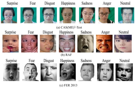 24]. RAF comprises 12,271 training samples and 3068 test samples, all of which were annotated by 315 human coders. To mitigate variability stemming from individual annotator biases, the final annotations were refined using crowdsourcing techniques. Within the RAF dataset, facial images are categorized into seven classes, encompassing six basic expressions—anger, disgust, fear, happiness, sadness, surprise, and neutral.
