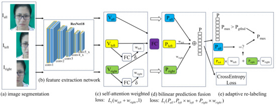 Figure 5. This approach comprises five distinct modules: image segmentation, a feature extraction network, self-attention weighted, bilinear prediction fusion, and adaptive re-labeling. Notably, image segmentation, weighted self-attention, and bilinear prediction fusion are integrated into a self-attention auxiliary module designed to enhance the efficacy of expression recognition. Furthermore, the adaptive re-labeling module is critical in accurately identifying expressions with uncertain labels within the dataset.
