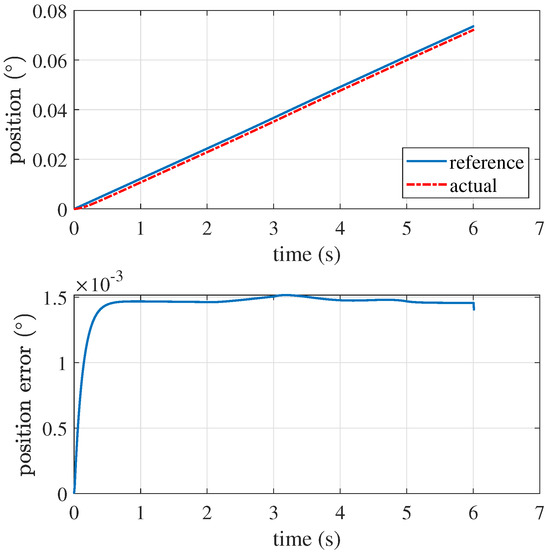 In this section, the imaging by a space camera is simulated and analyzed. The center of the field of view is aligned with the target star when the pointing platform is at the initial angle of 0. As the satellite moves along its orbit and undergoes attitude variations, the pointing platform maintains the target star at the center of the field of view during a six-second integration time by compensating for image motion using the IMC model. The satellite operates in a low Earth orbit: the orbit height h is 400 km and the earth radius R is 6400 km. The satellite’s attitude changes, caused by disturbance factors, are also taken into consideration. At 3 s, a disturbance of adding 100 arcseconds to the satellite’s three-axis attitude angles is introduced. The sampling frequency of the simulation is 200 Hz. After calculating the IMC model, the two-axis reference position, actual position, and the position tracking errors of the pointing platform were determined, as shown in Figure 5 and Figure 6, with the azimuth axis in Figure 5 and the elevation axis in Figure 6, respectively. The pointing platform was able to achieve high control accuracy and ensured compensation for the image motion.