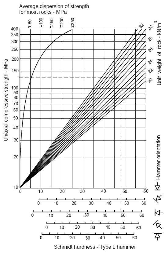 The value of JCS (joint compressive strength) can then be determined using the diagram (Figure 1) proposed by Deere and Miller [52]. In this diagram, various Schmidt indices are plotted along the x-axis as the hammer inclination varies, while JCS values are indicated on the y-axis. To determine the JCS value, it is necessary to use one of the inclined lines present in the diagram, selected based on the unit weight of the rock under examination.