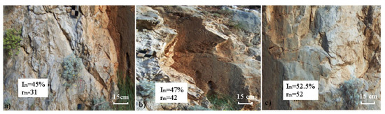 Survey 1. At Monte Pellegrino (Figure 2), the experimentation was conducted on the wall with an average inclination (α) of 81° and an azimuth of inclination (β) of 355°, situated along an artificial trench (Monte Ercta) carved into Mesozoic limestone in the 1950s. The survey of the mesostructure, carried out using traditional techniques (scanlines and Clarr compass), terrestrial photogrammetry [53], and laser scanning, revealed the same oriented structure characterized by four main families of discontinuities. Two families (set 2 and set 4) have a “direction” sub-parallel to the wall, while the other two (set 1 and set 3) have a direction almost orthogonal to the trench. The surveys were conducted using the RIEGL LMS-Z210 laser scanner, featuring a scanning field of 80° × 360°. It is capable of measuring up to a distance of 486 m with a precision of 14 mm, using programmed angular steps. The acquisition speed can reach up to 9387 points/s, and the wavelength of the emitted beam is 1μm. The laser scanner was positioned at a minimum distance of about 10m, and the scan was executed with a resolution of 0.018°. For reflectivity evaluations, a section of the wall was chosen where discontinuities coexist, exceeding 1m² in extent, with different types and degrees of alteration. On the discontinuities characterized by smooth surfaces in the upper portion (Figure 2a), which exhibit a corroded and vacuolar appearance near the roadbed, the measured values of reflectivity (I) range from 35% to 55%. The lower values (I = 35% ÷ 45%) are associated with fractured rock, resulting in the wall having pronounced small-scale roughness. Similar values were measured at the altered discontinuities with surfaces rendered rough due to the presence of pores and vacuoles. In the presence of altered but smooth surfaces with a uniform texture (Figure 2b), the measured values of Im averaged approximately 47%. Intact and slightly altered rock (Figure 2c) provided an average Im value of 52.5%. These measurements were compared with rebound values (r) obtained using the Schmidt hammer. In the zone dominated by fractured rock and on altered discontinuities with a corroded and vacuolar surface, the average rebound value (rm) range is 31%. On altered discontinuities with a uniform surface, the average rebound value (rm) is 42%. On slightly altered surfaces or massive rock, average rebound values (rm) are 52%. In the first zone (fractured rock), it is highly likely that the results are influenced by the extremely variable volume of rock fragments on which the measurements were taken. As the value of I increases, there is also an observed increase in the rebound value (r).