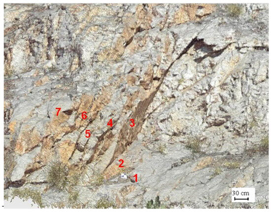 Photo of the seven discontinuities chosen for the assessment of rebound and reflectivity values. Discontinuity 1–7 of the Figure 4. The arrow indicates the portion of discontinuity investigated.