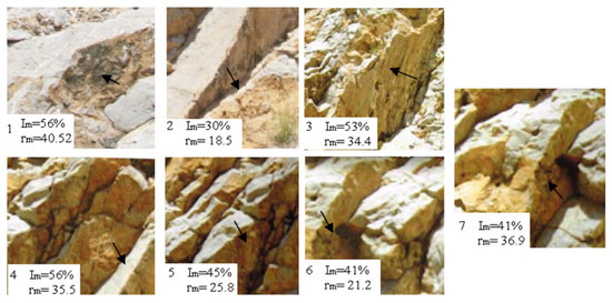 The lowest values of r and I are associated with the discontinuities (2) in Figure 5 characterized by significantly altered and highly fractured surfaces.