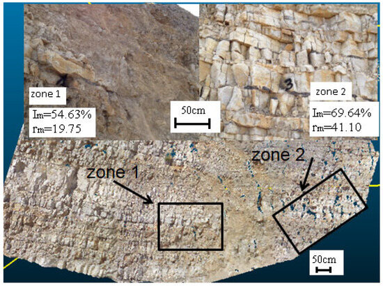 Survey 3. At the site of Castronovo di Sicilia, a rock mass exhibiting an overall west-dipping monocline, interrupted by two main fault systems—one oriented NW-SE and the other NE-SW—was investigated. These faults tend to intersect, leading to varying degrees of fragmentation of the structure, particularly in the southwestern sector where the quarry in question is located. For this site, the FARO FOCUS 3D laser scanner was used. For the scanning investigation describing the morphology of the subject and ensuring the necessary overlap, two station points were established within an area adjacent to the surveyed zone, avoiding shadow zones and areas of unclear identification. This approach allowed for scanning at a density of 1 point every 4mm, resulting in an overall collection of approximately 30 million points. This study was conducted by comparing the strength values measured using traditional direct techniques (Schmidt hammer) with those obtained from the survey through laser scanning in two specifically chosen zones (Zone 1 and Zone 2) within the quarry area (Figure 6). In Zone 1, near the alteration, an average reflectivity value (Im) of 54.63% was measured, while in the area less affected by rock alteration, a mean reflectivity value (Im) of 69.64% was observed. This analysis indicates that the zone characterized by alteration (Zone 1) exhibits lower average reflectivity values compared to those found in Zone 2. The average rebound value obtained on the wall identified in the first zone (Zone 1) is approximately (rm) 19.75; in the area located a few meters away from the altered zone (Zone 2), we observed an average rebound value (rm) of 41.1.