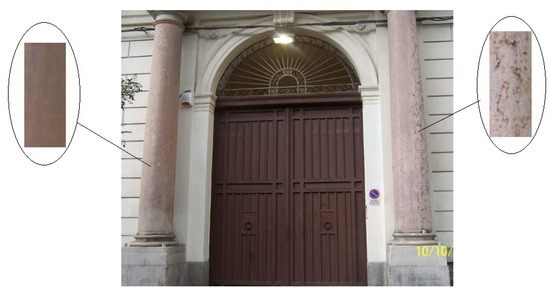 Survey 5. The research also focused on the study of the columns at the main entrance of Palazzo Jung in Palermo. The lithotype, ammonitic red limestone, characterized by a nodular and sometimes “flaser” structure, undergoes alterations when exposed to outdoor conditions, highlighting textural non-uniformities and, in severe cases, causing surface fractures [51]. The column on the right (see Figure 8) is prominently exposed to marine spray, resulting in signs of selective weathering that affect not only the chromatic appearance but also the rock’s state of aggregation. On the same column, different degrees of alteration can be observed depending on the orientation of the cylindrical surface to the marine spray. The column’s surface experiences a general whitening phenomenon, with intensity progressively increasing from areas facing the wall. The column exhibits the most altered band along a generatrix exposed to the east, towards the sea. For the altered column, the values of rebound (r) are dispersed in a wide range between 20 and 71. The surface of the altered column was divided into four vertical strips based on the visible level of alteration. The measured reflectivity values ranged between 45% and 55% (4 points in Figure 9). For the intact column (on the left), the reflectivity values ranged between 52% and 57% (1 point in Figure 9). The processed data further highlight the influence of the intensity of alteration on both the reflectivity values (I) and the rebound values (r) simultaneously.