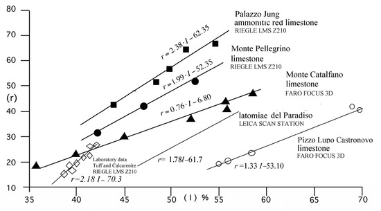 In the diagram in Figure 9, the relationships between average values of reflectivity (I) and rebound (r) for different lithotypes are compared. The figure displays data obtained from the six surveys performed on distinct lithotypes. From the overall analysis of the results, it can be concluded that the average values of the measurements obtained with the laser scanner are well correlated with those obtained with the Schmidt hammer. The figure also indicates the types of lasers used. Consequently, the parameters of the correlation curve depend on the wavelength of the beam emitted by the instrument and, essentially, on the model of the instrument used. The data were correlated using linear regression characterized by high values of the correlation coefficient (R² = 0.93–0.98). It is necessary to specify that the relationships obtained do not have absolute validity but undergo variations depending on the analyzed lithotype, as reflectivity is closely dependent on the type of material constituting the surface subject to the survey. This is evident from the diagram in Figure 9, where the results obtained for different lithotypes are compared. The correlation between the spectral signatures and the strength of stone materials depends on the degree of alteration, which itself is influenced by various factors including chemical processes, environmental conditions, and humidity. In the context of rock mass characterization, operations are carried out under the same conditions to ensure accurate zoning of the rock mass.
