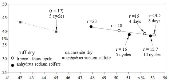This study, conducted in the laboratory, included controlled weathering processes in samples of tuff and calcarenite to validate the correlation between reflectivity (I) and the degree of alteration. Tuff and calcarenite are two rocks that exhibit the typical mechanical behavior of hard soils/soft rocks. Two distinct techniques were employed to induce weathering processes: one based on the effects of thermal stress induced by repeated cycles of freezing (−20 °C) and thawing (+105 °C), and a second based on volume variations inanhydrous sodium sulfate during crystal formation. Tuff samples were subjected to freeze–thaw cycles, and both tuff and limestone samples were immersed in a saturated solution of sodium sulfate. In both lithotypes, a reduction in reflectivity was recorded as the material’s porosity (n) increased (Figure 10). The measurements provided variable values of reflectivity (I) within similar ranges for each lithotype, even in the presence of significantly different porosities. Schmidt hammer measurements were taken at the beginning and end of each weathering process. Similar to reflectivity (I) the values of rebound (r), regardless of the technique and lithotype, decreased with the progression of the weathering process, and the two parameters are correlated with linear regression.
