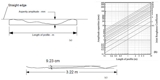 The obtained profile is then visually compared against typical profiles proposed by Barton and Choubey [56]. Nevertheless, there is a concern among researchers that the subjective nature of the visual comparison method could introduce biases in the JRC estimations. However, the limitation of this method lies in the length of the standard profiles compared to that of the entire joint, and the JRC parameter is significantly influenced by the scale effect. Barton [29] provides a precautionary method to account for this influence and to estimate the scale-corrected JRC. In this method, the value of JRC is obtained by correlating it with the inclination of the asperities (Figure 11a) [50]. The diagram (Figure 11b) is used to extrapolate the approximate JRC value of a discontinuity in Monte Catalfano (Figure 11c).