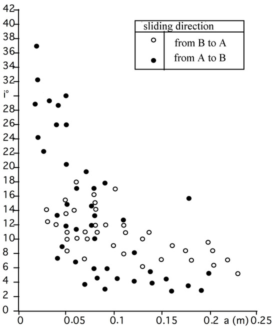 The results obtained indicate extreme variability in the angle of inclination (i°) as the base amplitude of the asperity varies and in the direction of the hypothesized kinematics (Figure 13). In particular, the inclination angle (i°) is maximum for asperities with small base amplitudes, similar to what is observable in laboratory tests, and it progressively tends to decrease for larger base amplitudes found on larger discontinuities. This result allows attributing, for a given direction, orientation, and a certain extent of the surface, an inclination angle (i°) value that is already corrected for the scale effect.