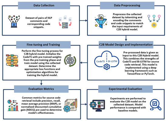 This section outlines the research methodology employed in this study, which focuses on developing a comprehensive framework known as the C2B hybrid model for source code retrieval. In light of the growing complexity of software systems and the extensive repositories of available code, the efficient and precise retrieval of pertinent code snippets has become increasingly vital for software developers. To address this challenge, we harness the advancements in deep learning and natural language processing. Our methodology involves a unique fusion of two powerful models: CodeT5, which is known for its good code comprehension capabilities, and the bidirectional long short-term memory (Bi-LSTM) model, known for its good sequential modeling capabilities. This integration aims to elevate the performance of source code retrieval by effectively capturing both the semantic relationships and sequential dependencies inherent in natural language queries and code snippets. The research methodology encompasses several key steps, as illustrated in Figure 1, which depicts the workflow of the proposed C2B hybrid model. This figure visually guides our approach, allowing for a clear understanding of the steps involved in achieving our research objectives. The research methodology covers the following key steps: