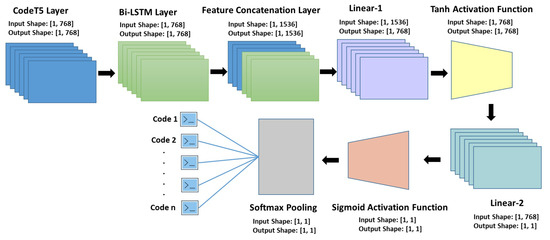 - Concatenation: To combine the query and code embedding vectors () from CodeT5 and Bi-LSTM using concatenation, we concatenate the vectors along a specific axis. Let us assume the query embedding vectors obtained from CodeT5 and Bi-LSTM are represented as “” and “”, respectively. Similarly, the code embedding vectors from CodeT5 and Bi-LSTM are represented as “” and “”, respectively. The concatenation operation can be represented using Equations (11a) and (11b).Here, we concatenate the query embedding vectors from CodeT5 and Bi-LSTM to create a new joint representation “” Similarly, we concatenate the code embedding vectors from CodeT5 and Bi-LSTM to create a new joint representation “”. The resulting shapes of “” and “” will be , where “” represents the dimensionality of the query embeddings from CodeT5, “” represents the dimensionality of the query embeddings from Bi-LSTM, “” represents the dimensionality of the code embeddings from CodeT5, and “” represents the dimensionality of the code embeddings from Bi-LSTM. These concatenated representations can then be used for downstream tasks that require joint representations of the query and code information from both CodeT5 and Bi-LSTM.