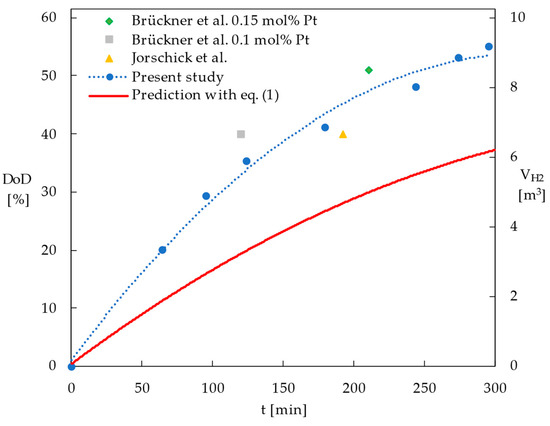 | Jorschick et al. [27] | Batch | 0.3 wt% Pt | 1.1 mol | DoD = 40% in 192 min |