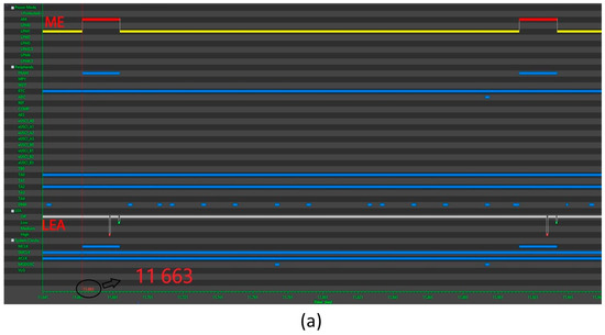 Microcontroller activity. The ME line is yellow if the processor is in low power mode and red if it is running. The LEA line is grey when the LEA is inactive and green or red when it is active. (a) No phonation was detected, and LEA activates twice: for FFT and magnitude computation. (b) Phonation detected, LEA activates four times for FFT, magnitude, filtering, and autocorrelation.